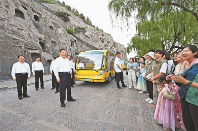已有1500多年历史的龙门石窟,是重要的世界文化遗产。习近平来到这里,察看石窟整体布局风貌和代表性窟龛、造像,同现场的文物保护工作者亲切交流。他强调,要把这些中华文化瑰宝保护好、传承好、传播好。游客们见到总书记,都十分欣喜,纷纷向总书记问好。习近平不时同大家交流,特别鼓励小朋友们多到实地寻溯中华文化,从小树立文化自信。他指出,文旅融合前景广阔,要推动文旅产业高质量发展,真正打造成为支柱产业、民生产业、幸福产业。